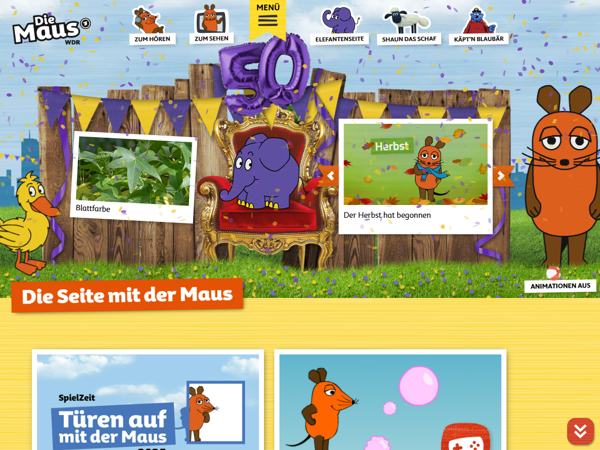 Auf geht’s zur Seite von der Sendung mit der Maus! Hier erwarten dich die schlaue Maus und der kleine Elefant. Aktuell gibt es ganz viel rund um das Thema Herbst zu entdecken! Klick dich rein und erfahre warum sich Blätter im Herbst verfärben, wozu Eichhörnchen ihren Schwanz brauchen und vieles mehr!